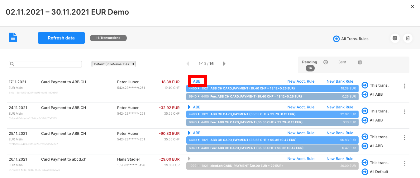 • But be careful: the condition ABB would also a match a transaction named cabbage.com. In this case, it might be wiser to use ABB CH as the condition or to increase the priority of the rule cabbage.com to make sure that this rule will get applied first.